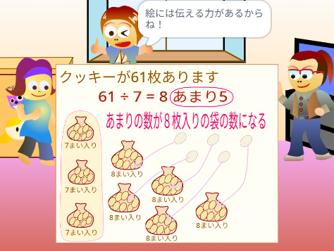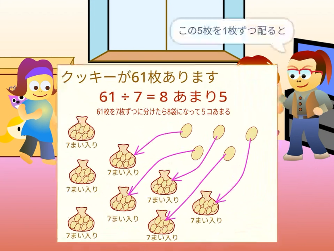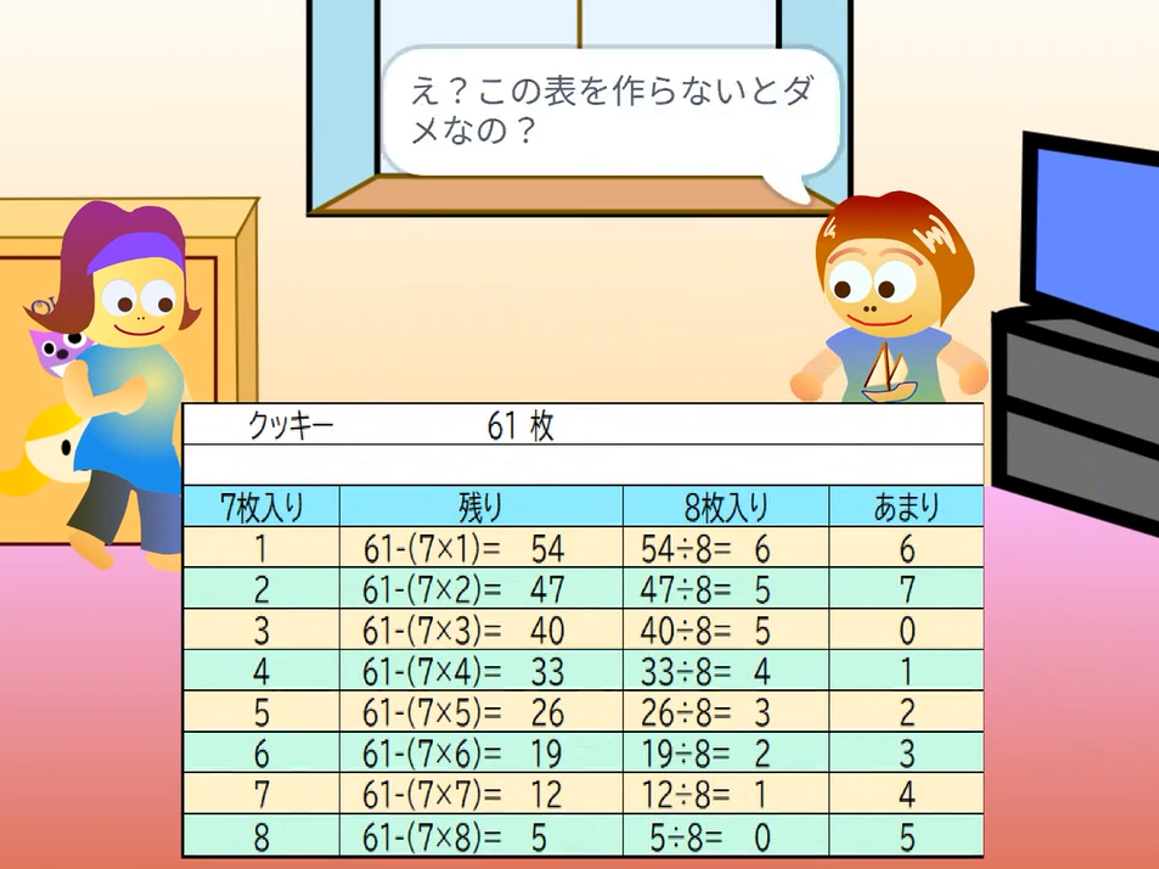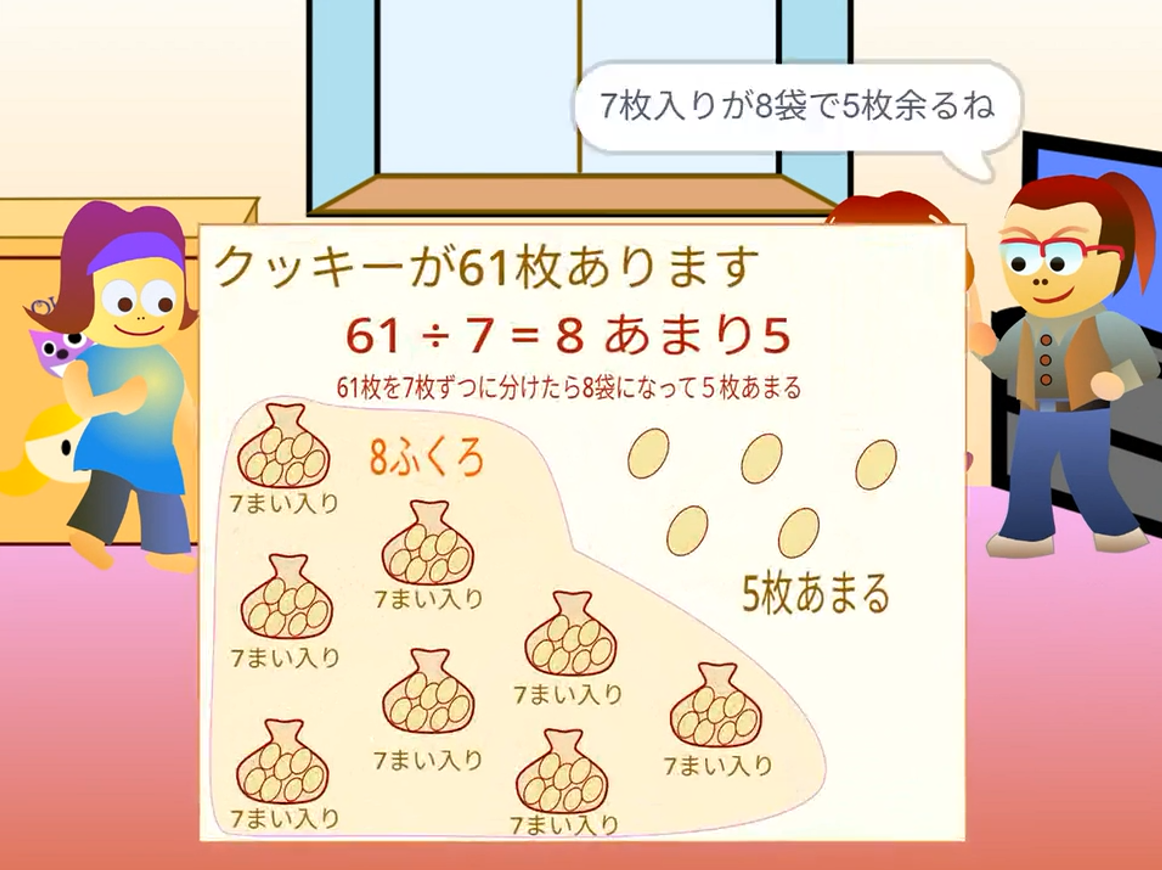 もんちゃん小学3年生、割り算が大事なお年頃です。宿題では割り切れない数の割り算を余りを用いて答えるものが出てきました。さてその応用問題、61枚のクッキーを7枚入りと8枚入りの袋に分けて入れたらそれぞれ何袋ずつ必要か?という難問が立ちはだかりました!