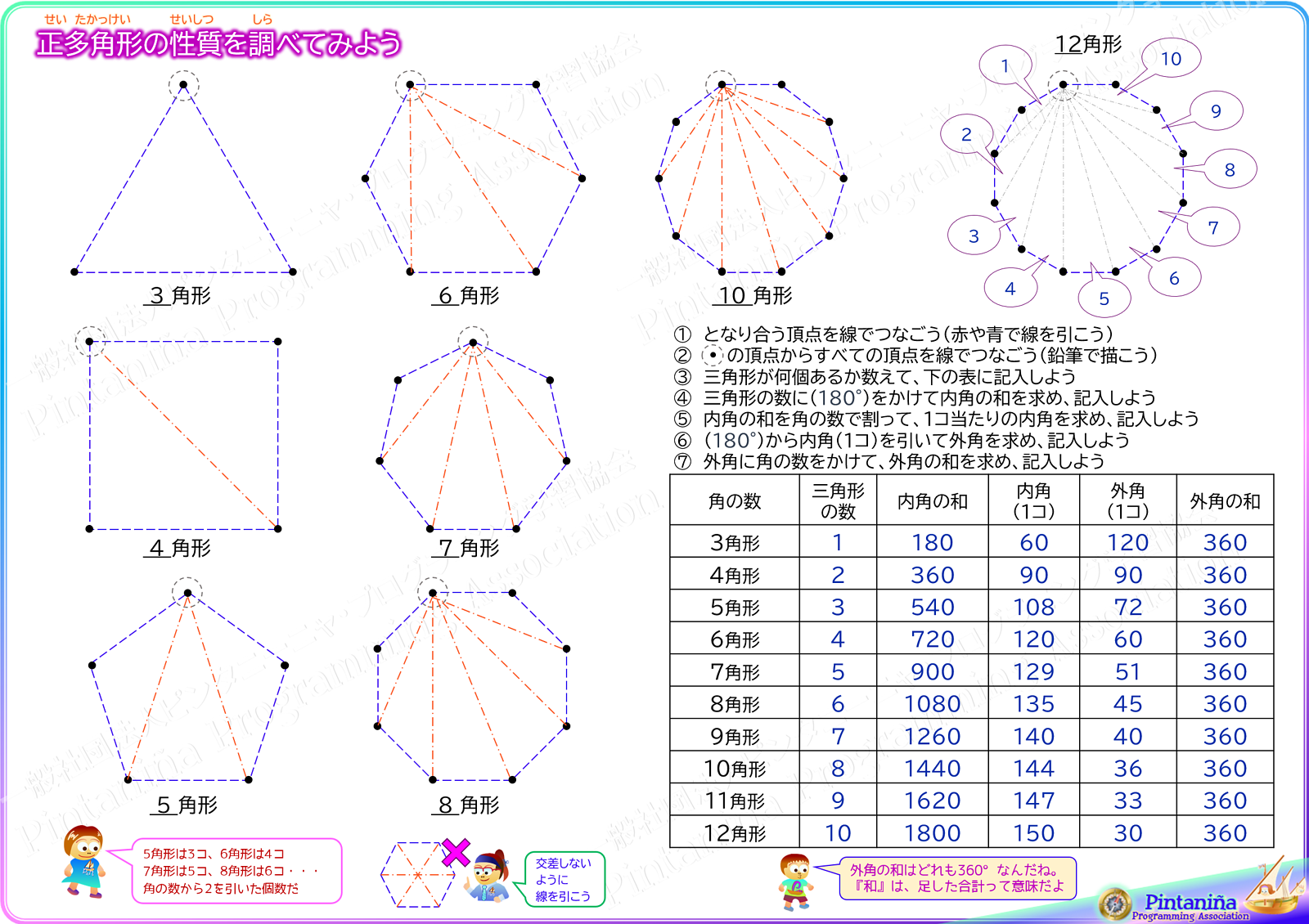 | 正多角形の性質を考えてみよう ~辺や角の数、内角、外角、とか~ | |