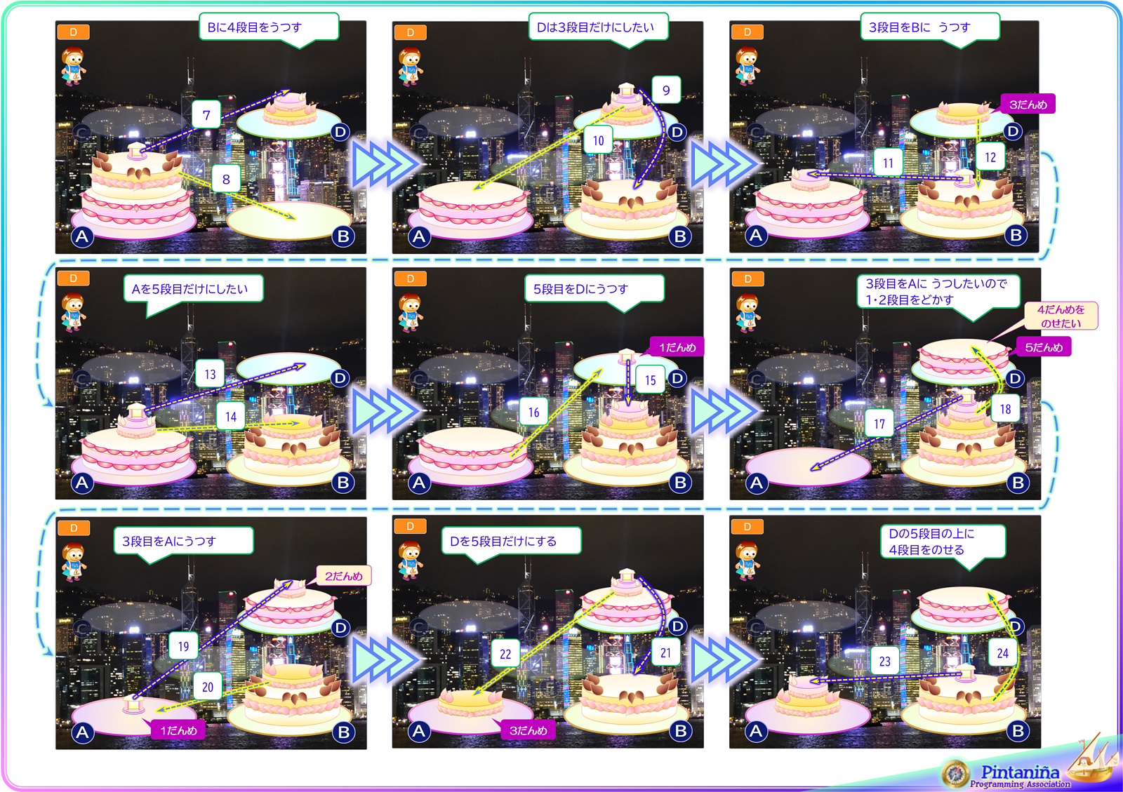 このとき、 Bに4段目を置きたいので、1⇒D、2⇒B、1⇒BでBに2段のケーキ完成・Dは空きとなります。空いたDに3段目を置き、1をAに一旦載せればDに3段のケーキが完成・Bが空きます。空いたBに4段目を置いたら、その上に3段目をのせたい。ここで、