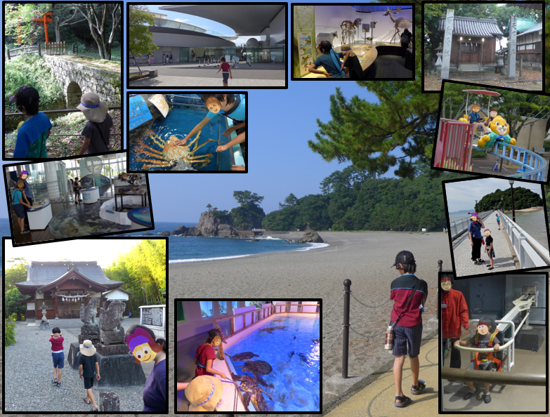 竜王崎の海神神社をお参りしたりビーチで石探しをしながら時を待ちます。9時になると桂浜水族館がオープンしたので早速入場しました。いろいろ尖ったことをすることで有名なこの水族館、早速ウミガメに餌やりという変化球にもんポコはドストライクです。いまだかつてこんなに大きい水棲動物に餌をあげたことはないかも。餌で大量のカメを操れるのが嬉しいみたいです、カメ使いもんポコ。