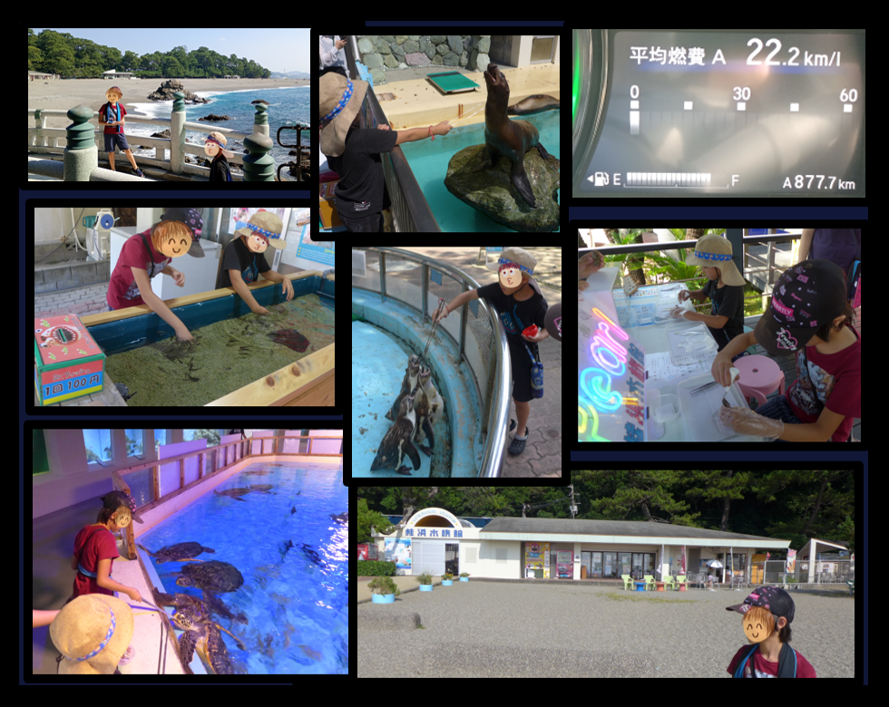1回から奥に建物を抜けると、水遊ゾーンといういわゆる魚以外の水族館のアイドルたちに会えます、ペンギンとかアシカアザラシ。上に上がると上から見ることができ、1回からは水槽を横から見ることができます。これで一通り見終わりました。お土産コーナーで何を買うか探します。マグネットでくっつくカエルのぬいぐるみが気に入ったポコちゃん。サメのタオルキャップを選んだもんちゃん、実用的な物がイイとのこと。シッカリしてます。15:15到着で16:40出発、2時間半かけて満喫してきました!