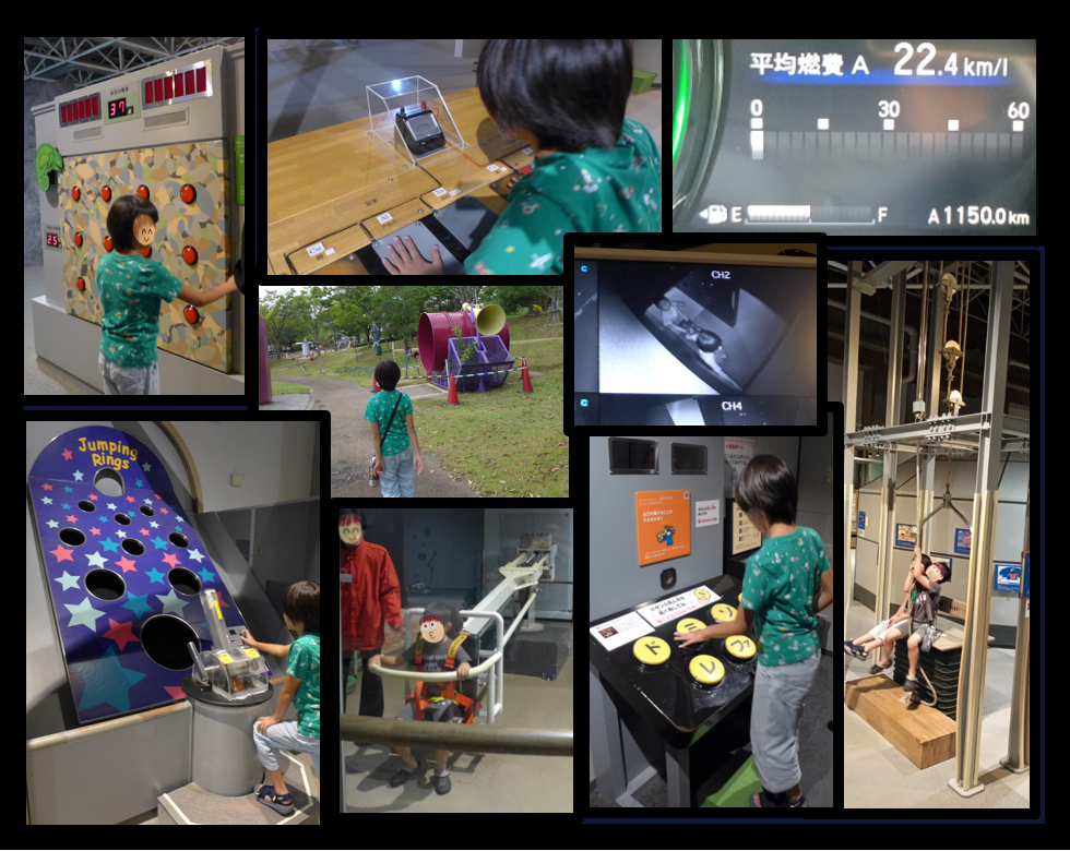次に生命と環境のコーナーへ。まず、お魚を作って海中探検をするようなバーチャルフィッシュアドベンチャーで遊びます。クイズやパズルの要素もあり頭を使うのでイイですね!次は走ったり重さを合わせたりしたあと錯覚コーナーに来ました。一室丸ごと傾かせた部屋があり、これは相当やられました。重力の方向がバグってバランスがおかしくなります、想像以上の感覚ハック!さらに暗闇の迷路もあり、視覚が閉ざされた世界を体験できます。静岡の「るくる」にもありますね、これ。カブトムシと綱引きしたり、壁の光るボタンをタッチしたり、体を使うものも多くて飽きません!