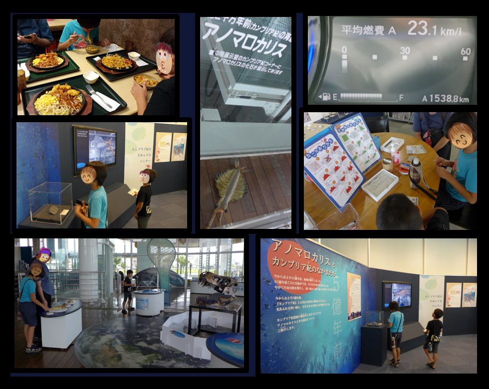 2階でチリメンモンスターを見たり折り紙でカニや魚を作ったら、1階にもどってスタンプラリーの台紙を提出。古代生物のカワイイシールをもんポコで2枚ずつ貰いました。アノマロカリス、ステノプテリギウス、ハプロフレンティス、ヨホイア・テヌイスが描かれてます、カワイイ。また、アノマロカリスのボールペンをお土産に買って、車に戻りました。