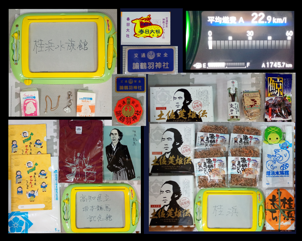 また、桂浜水族館で自分で採った真珠で作ったアクセサリーは宝物です、思い出でもありますし。諭鶴羽神社の交通安全ステッカーも実は相当レアです、行くのが相当困難ですからね。