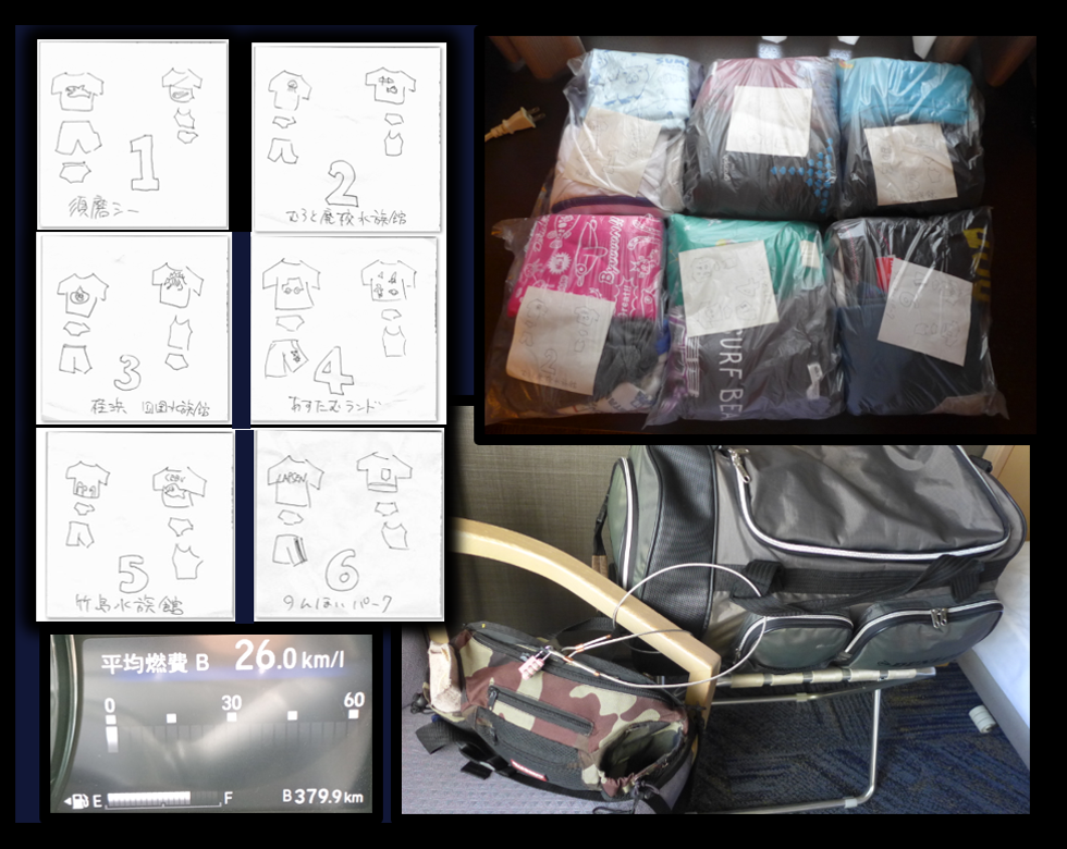 旅行で案外厄介なのが荷物ですよね。日数分の着替えはナカナカ大変ですが、1泊分ずつビニール袋に分けて入れてます。何が入っているか絵に描いておけば分かりやすくて便利ですよ。秋冬の旅行は荷物が増えますが、夏なら3点セットで済むから楽です。