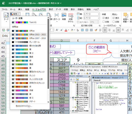 新しいファイルを作ろうとして新規の『空白のブック』で作ると、配色がデフォルトなんですよね。配色を変えたブックからコピペすると色が変わってしまう問題もありますから、いつもの配色にしたいところです。パワポならデザインタブの右の方にありますが、Excelはどこにある?って毎回悩みます。ページレイアウトタブの左側に溶け込んでいます、パワポの悪目立ちに比べたら控え目すぎますね。